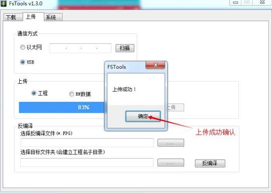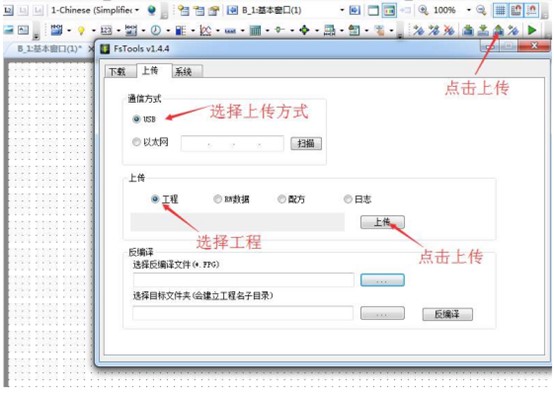 2. 軟件點擊”上傳“,設(shè)置通訊方式,選擇上傳工程,點擊上傳按鈕