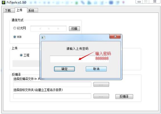 2、輸入正確的上傳密碼,默認為”888888“,如果默認上傳密碼被修改會提示密碼錯誤,或者提示禁止上傳就需要專業(yè)人員進行解密了,有需要可以聯(lián)系我們(百度一下速捷工控)