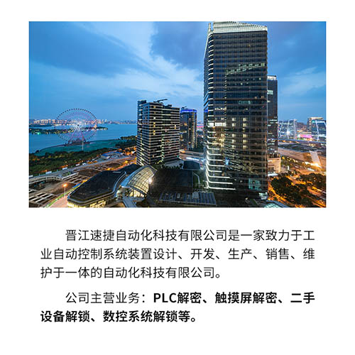 晉江速捷自動化科技有限公司 總部地址:福建省晉江市安海汽車站旁 PLC解密電話:15059791632 觸摸屏解鎖咨詢:15059791632