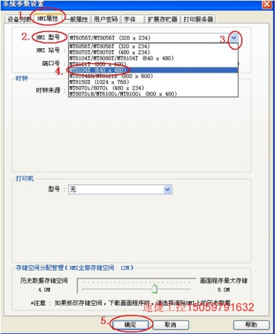 3、選擇“HMI 屬性”項,在 HMI 型號中,點下拉箭頭選擇 MT8104X 相對應的選項。